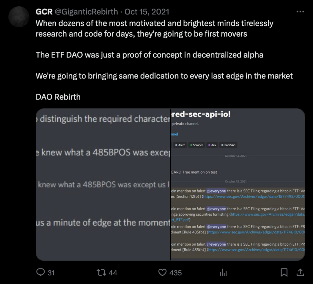 不久之后,他开始为一个新团队招募成员——命名为 RebirthDAO。其声称的目标是通过结合许多在 Crypto 市场中极为成功的交易者的力量,形成一个「去中心化对冲基金」。该团队的首次交易是在 2021 年 10 月的一次 ETF 新闻交易:旨在识别并利用 Proshares BTC 期货 ETF 的批准。据 GCR 称,这次交易非常成功——RebirthDAO 是第一批公开交易者之一,他们接收到了将 BTC 价格从 57.1K 美元推高到 59K 美元的新闻提醒,这给了他们相对于其他新闻交易者的宝贵几秒钟优势。