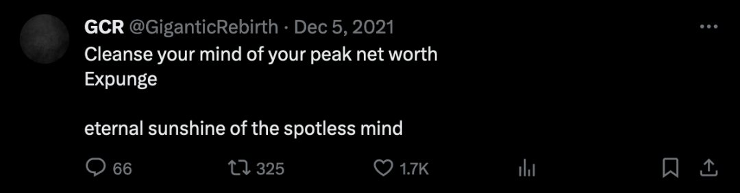 十月份,GCR 发布了他对年轻交易者的建议,要花时间在市场上寻找所有可能的优势。「即使你再活 80 年,也永远不会有如此容易获得世代财富的机会。」这种极度繁荣的状态大约持续了两个月——直到 2021 年 11 月底,Crypto 市场达到了历史最高点。