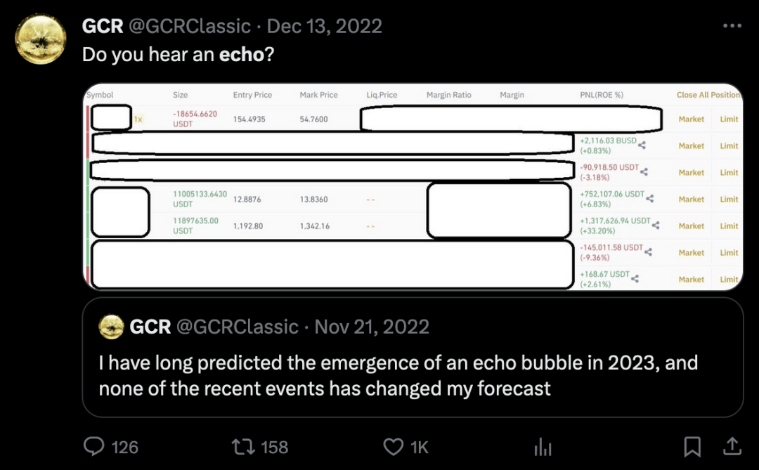 在 FTX 崩溃之后,GCR 永久停止了在@GiganticRebirth 账户上发布推文。他的备用账户@GCRClassic 提供了较少的个别交易更新,并给出了更一般的对未来的预测。