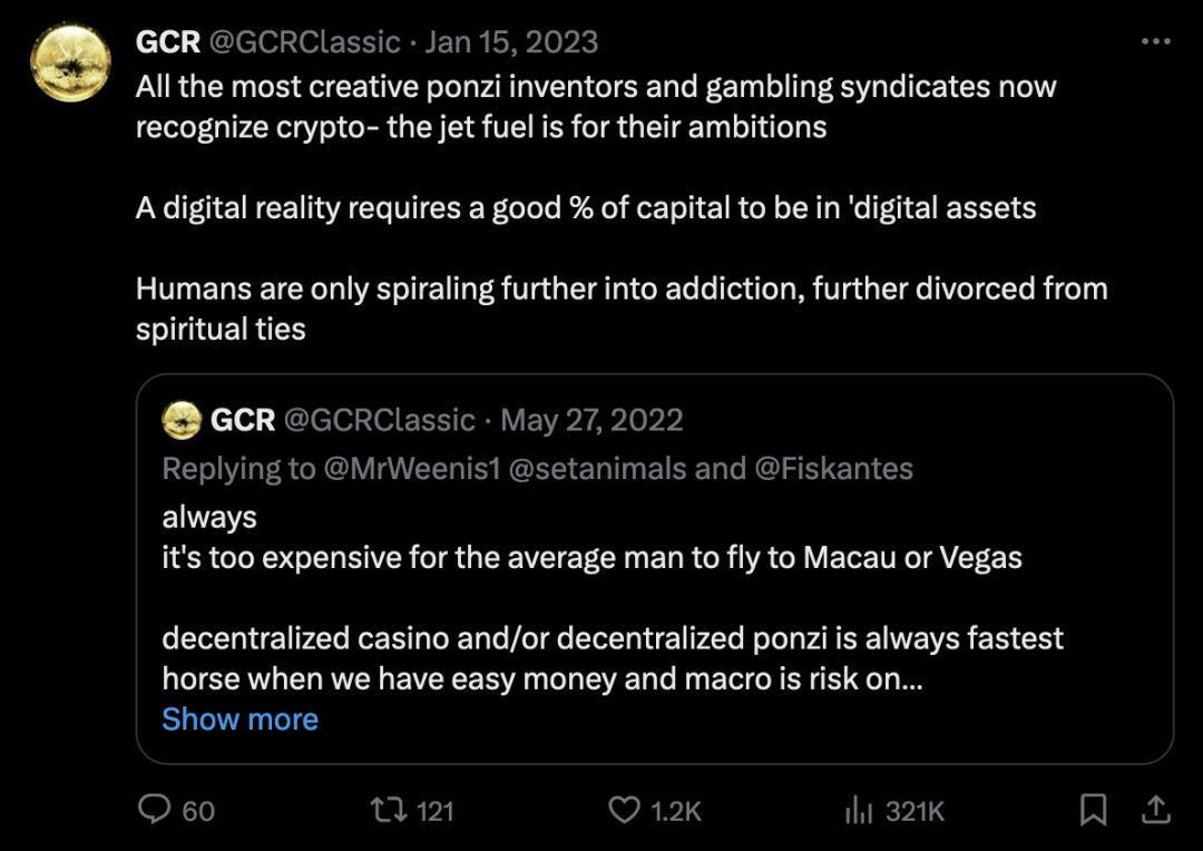 GCR是 Crypto 领域最著名的交易员之一。他在已倒闭的 FTX 交易所上以别名「Gigantic-Cassocked-Rebirth」为人所知,在 Twitter 上因其经常发表与 Crypto 相关且经过验证的投资技巧、多次成功的预测和聪明的写作而广为人知。