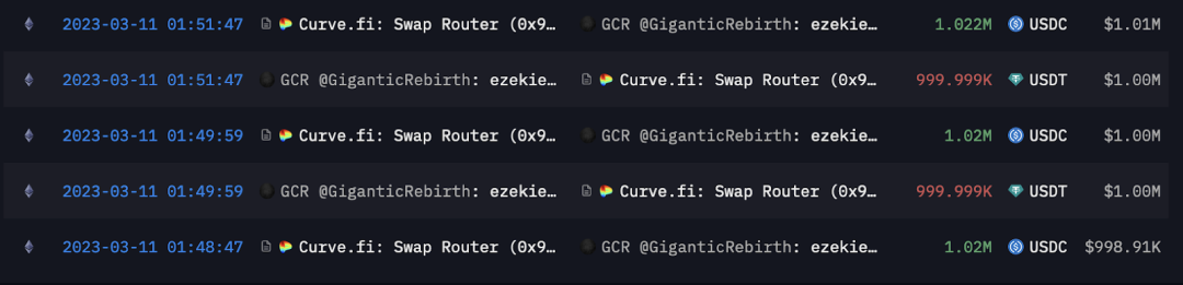 在 GCR 离开推特的一个月前,硅谷银行倒闭了。这导致 Crypto 中最大的稳定币之一 USDC 暂时脱钩,其价值一度跌至 0.88 美元。这一事件并未影响到 GCR——他在链上将总共 400 万美元的 USDT 换成了 USDC。