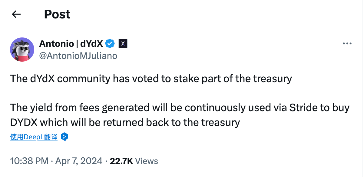 就在 4 月 7 日,Founder 提到,将会把国库的部分 $DYDX 质押,并用其收入来回购 $DYDX 。