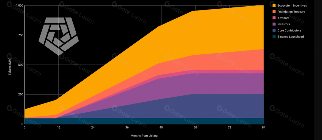 代币初始流通量为 15%,所有代币将在七年后流通。投资者、核心贡献者、顾问的代币将在上线一年内锁仓,接着三年逐步解锁。生态系统代币的总解锁时长为五年,基金会资金的代币解锁时长则是七年。