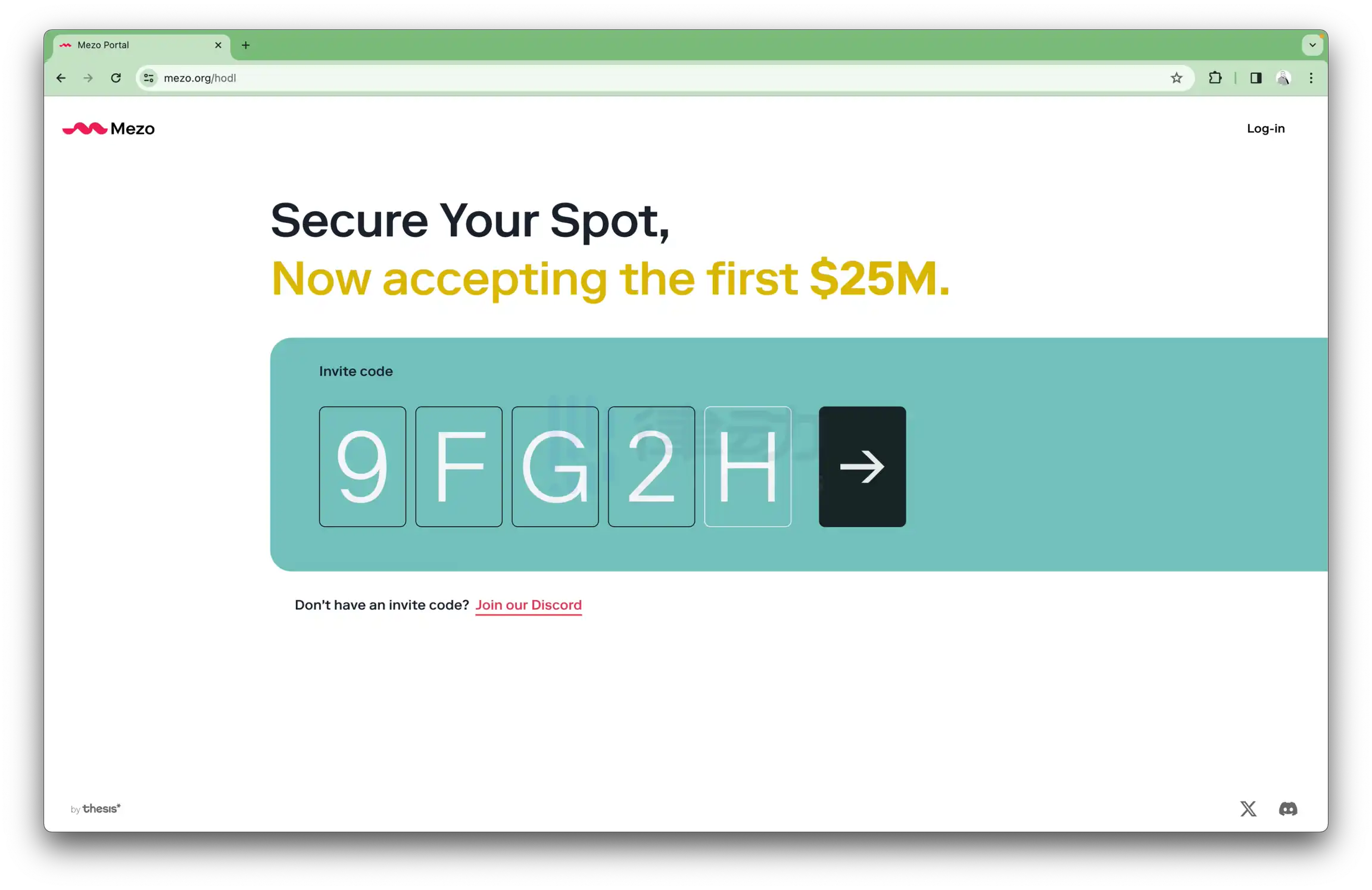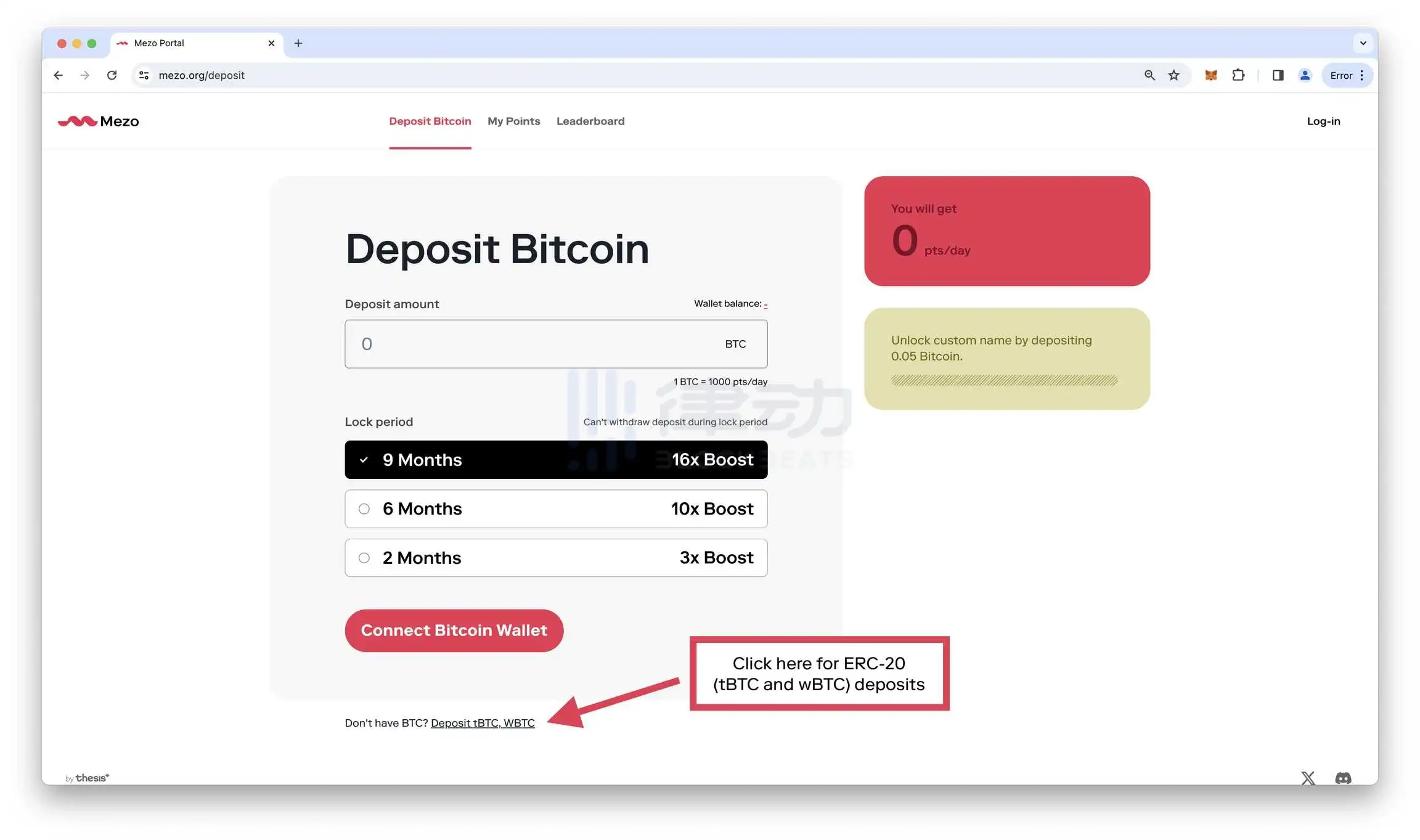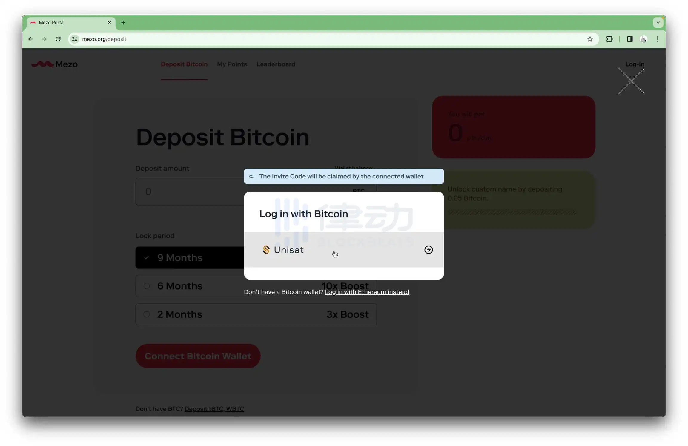 Mezo 上充值的货币是原生 BTC,如果用户想存入 tBTC 和 wBTC,可以在输入邀请码之后点击网站底部的链接。