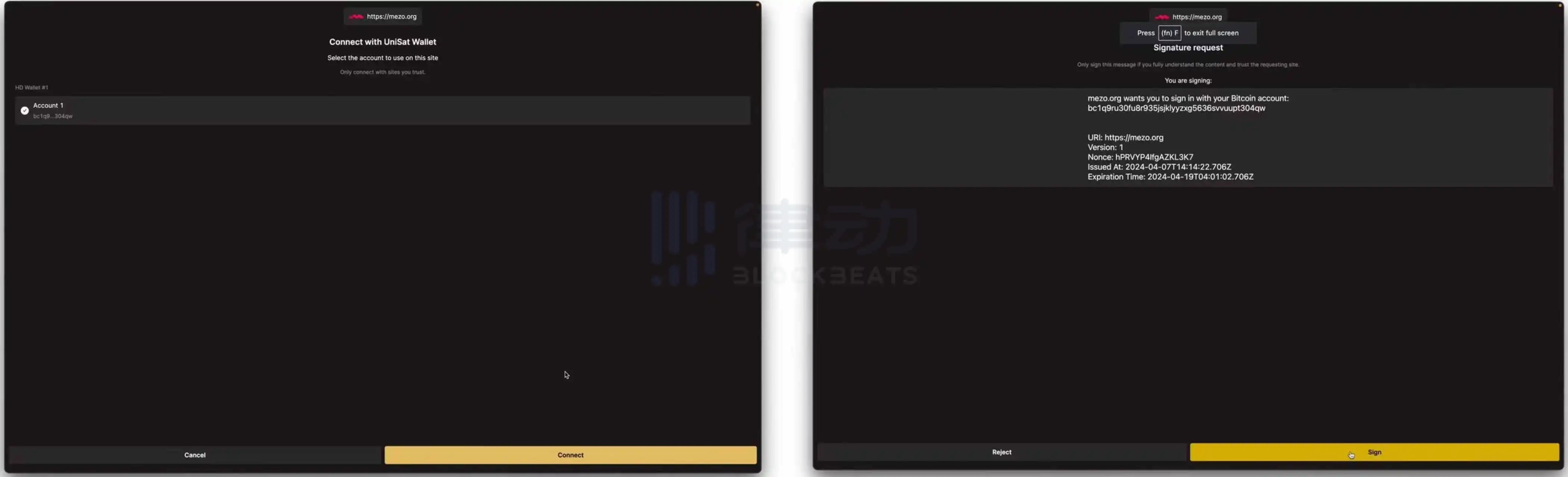单击「Log in with Bitcoin」后,依次点击「connect」和「sign」,完成 UniSat 连接和签名交易。