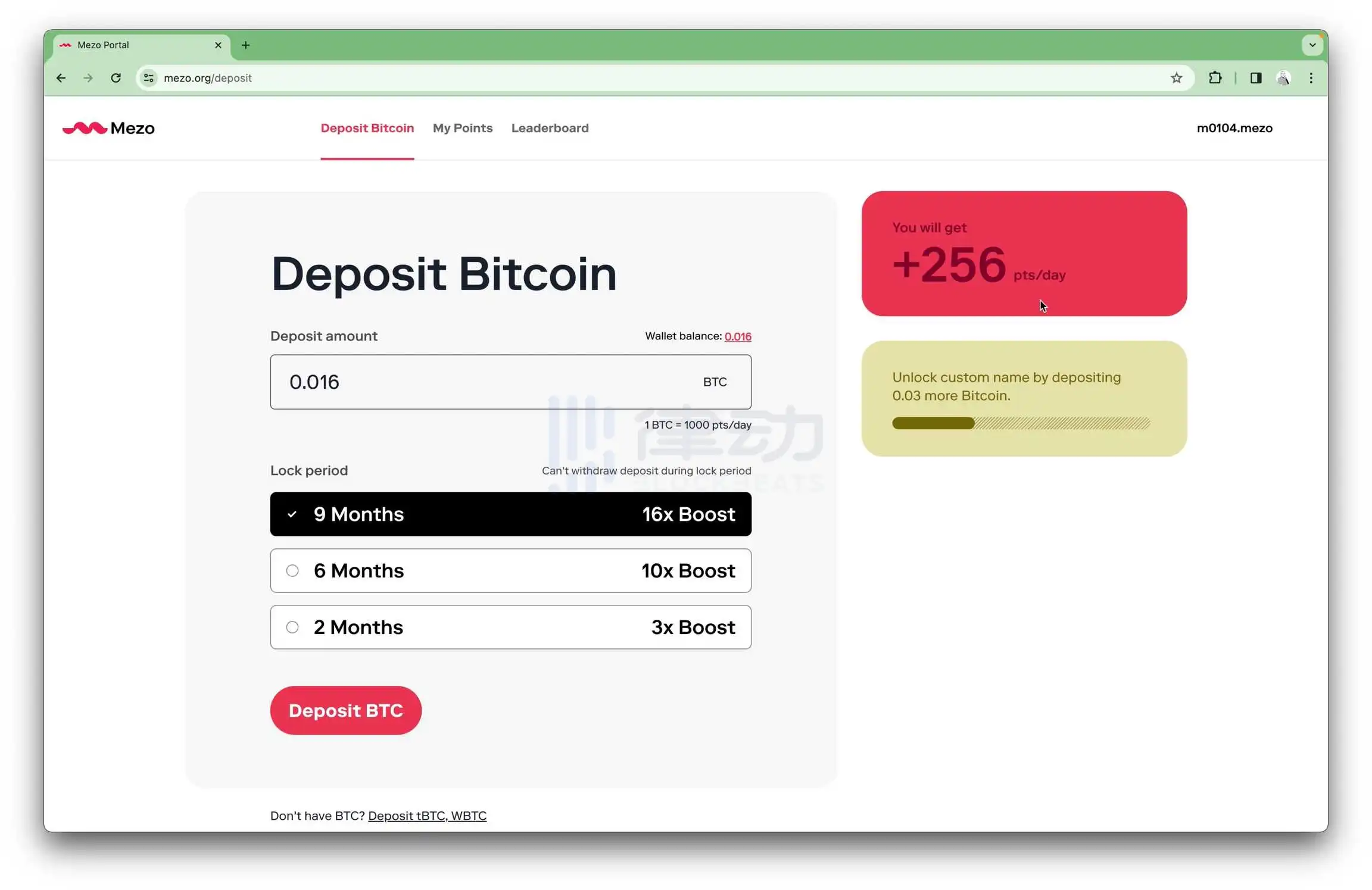 输入存款数量,点击「Deposit BTC」,签署交易后,用户的存款将被处理,可以在排行榜上看到自己的得分排名。