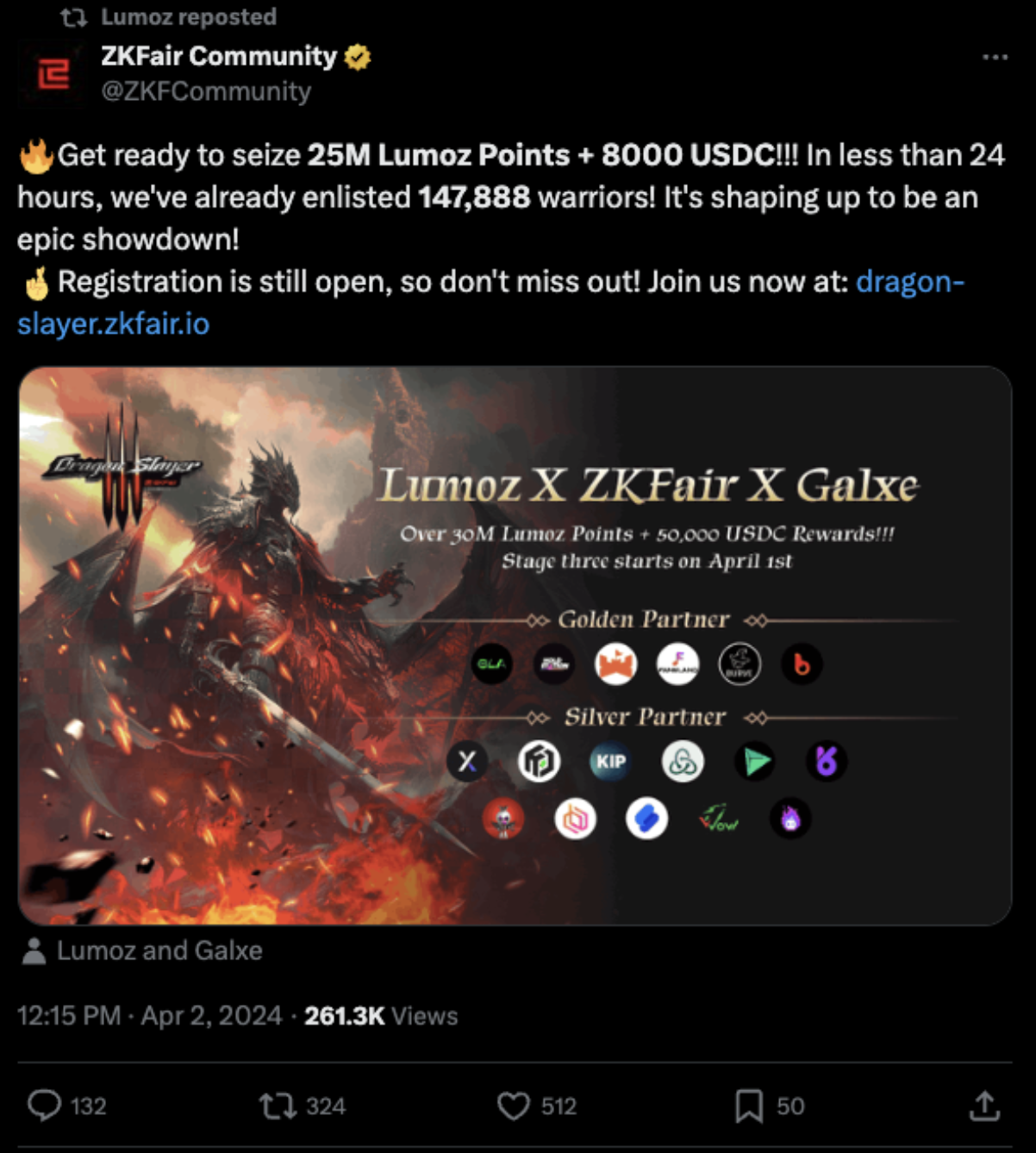 目前,Lumoz 还在持续和 ZKFair 以及 Glaxe 开展 Dragon Slayer 活动来激励用户参与。目前正处于活动的第三期,该期将发放 25M 个 Lumoz 积分和超过 8000 枚 USDC 的奖励。