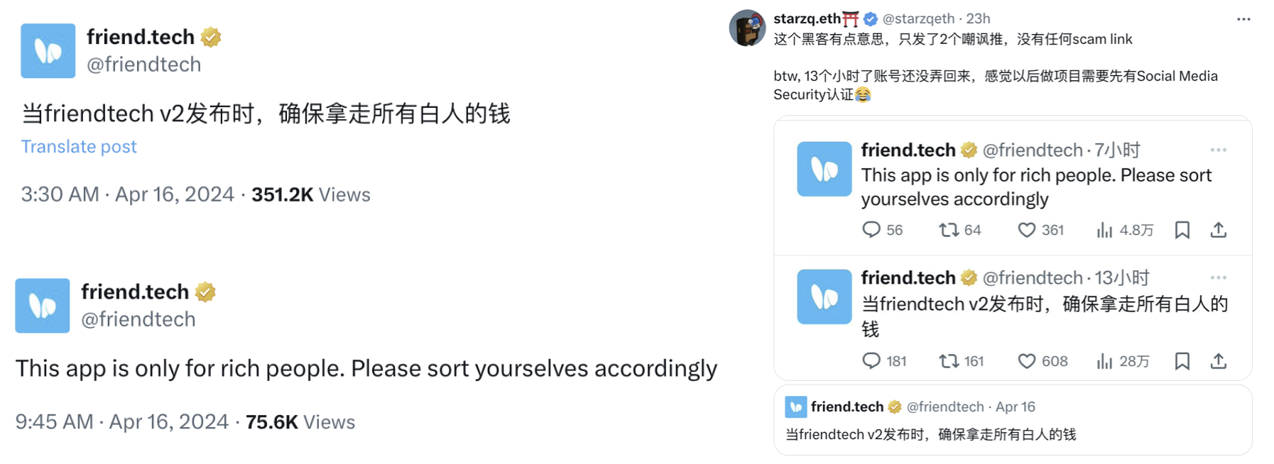 官推小编先是用中文发布了一条「当 friendtech v2 发布时,确保拿走所有白人的钱」作为开场,这条推文获得了超 35 万的阅读量。为什么要发中文?白人指的是谁?没等社区搞明白,六个小时后,官推再次发布一条推文,进一步解释了一下用意「这个应用程序只适合有钱人。请自行归类。」