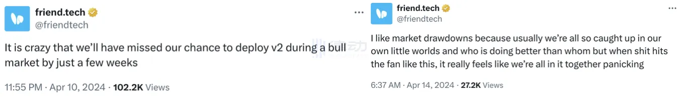 4 月 14 日,知名传奇交易员 GCR 发帖鼓励社区后,Friend.tech 官推也紧随其后发文:「我喜欢市场大跌,因为通常我们都过于专注自己的小世界,关注谁比谁做得更好。但是当形势变得糟糕,比如像当下的情况发生时,我真切地感觉到大家都在一起经历恐慌。」
