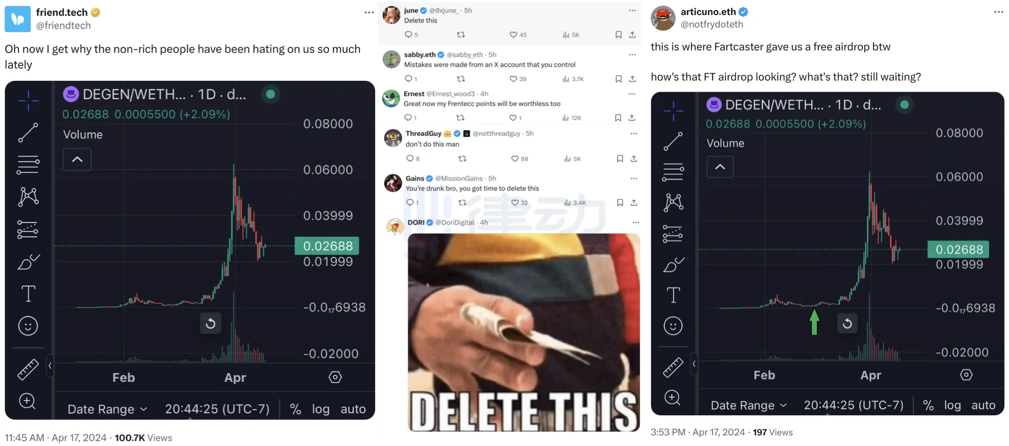 以及意料之中的,来自 Farcartser 社区的扎心回击:「这是 Farcaster 给我们空投的地方(DEGEN 暴涨之前),FT 的空投看起来怎么样?什么是 FT 空投?还在等吗?」