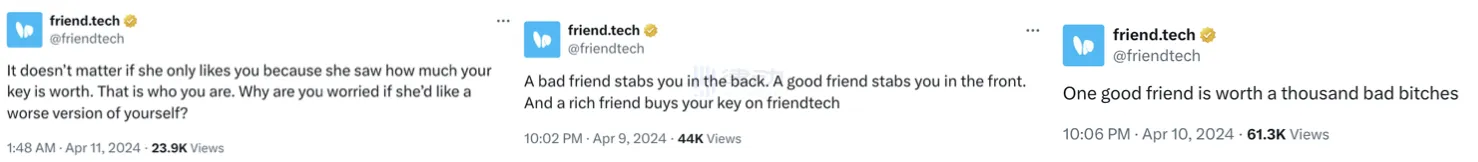 4月16日至17日,Friend.tech 官推连发数条推文,惊到了社区用户,这些推文内容大意均为「Friend.tech 的用户都是有钱人,没钱的人不要和 Friend.tech 沾边」。