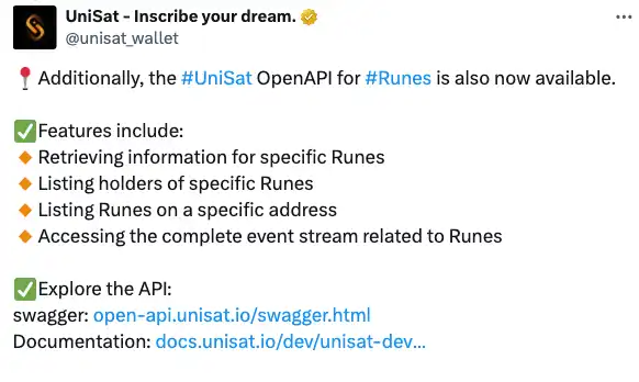 不过 UniSat 虽迟但到。目前,其在社交平台表示,已支持 Runes 的测试网。此外,Runes 的 UniSat OpenAPI 现已推出,功能包括: 检索特定 Runes 的信息; 列出特定 Runes 的持有者; 列出特定地址上的 Runes; 访问与 Runes 相关的完整事件流。