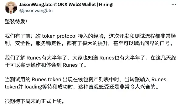 据 OKX Web3 钱包的负责人 Jason Wang 在社交媒体上透露,这次 Runes 的开发和测试流程非常顺利,安全性和服务稳定性都有显著提升,让整个团队感到兴奋不已。他们对 Runes 的研究和准备已经超过半年,现在终于可以让用户实际体验到 Runes 的魅力。
