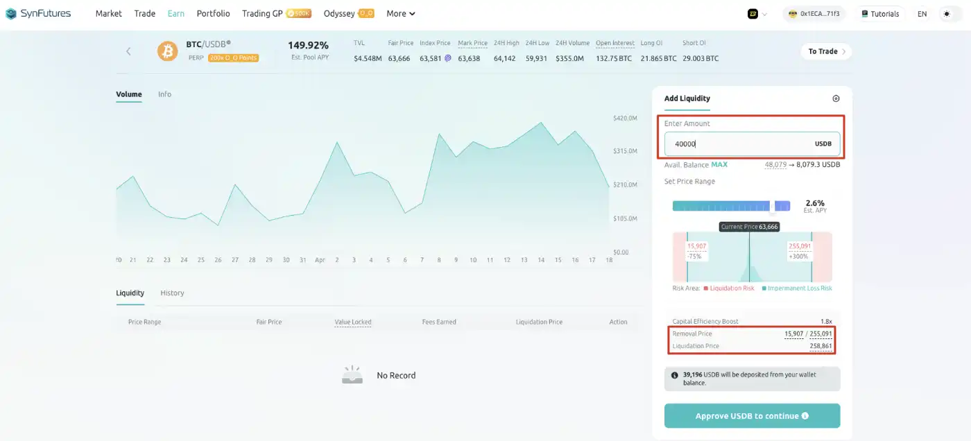 与在 UniSwap V3 提供流动性类似,在 SynFutures 添加流动性**也需要选择价格区间。**价格区间越窄,赚到的手续费和积分也越多,但相应的无常损失也越高。第二个红框里的意思是,**如果市场价超出了价格区间,你的流动性会被移除,并且会被清算。**所以为了避免这种情况,我们可以选择一个比较宽的价格区间,避免被清算。比如上图我选的价格区间是 15,907 ~ 255,091,要想超出这个价格区间,**概率小到可以忽略。**即使最极端的情况,一直下跌,这个价格范围也能让我从容的移除流动性,避免被清算。