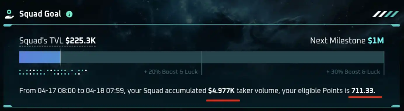 考虑到有邀请关系,我们只需要**用最后被邀请的那个账号去跟协议交互就可以了,这样其他两个号也能获得积分。**目前交易量是每 24 小时结算一次积分奖励,可以在战队那里看到自己前一天的交易量和获得的积分。
