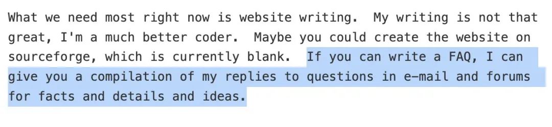 这是中本聪给大学生 Martti Malmi 布置的第一个远程工作任务——FAQ(常见问题解答)。中本聪说目前网站最需要的是一些写作内容,而他「不擅长写作,更擅长写代码」。原文翻译:「你可以考虑在 SourceForge 上搭建一个网站,目前那儿还没内容。如果你能准备一份 FAQ,我可以整理我之前在邮件和论坛里回答的内容给你,这样可以帮你获取所需的信息和灵感。」