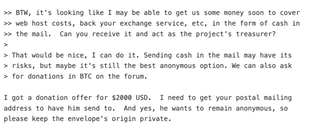 原文翻译:「我收到了一份 2000 美元的捐赠请求。但是我需要你的邮寄地址才能让他寄出。是的,他(捐赠者)希望保持匿名,所以也请保护信封来源的隐私。」
