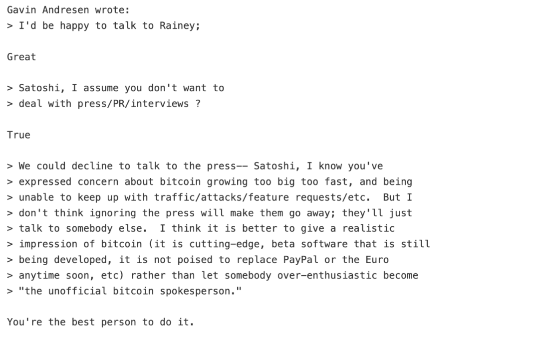 一个月后,在这篇中本聪发给 Gavin Andresen 的邮件(抄送给了 Martti)中,中本聪再次确认他不想参与任何的媒体公关内容与访谈。并且这里可以看到,中本聪十分担忧比特币增长过快,导致各种功能、攻击防御等需求无法被满足。同时他们对舆论的狂热感到担忧,当时出现了一些非官方的比特币代言人进行过度吹嘘,甚至宣传会取代 Paypal 甚至是欧元。他们希望在媒体中更强调比特币是一个前沿的测试,还没到大规模应用的程度。