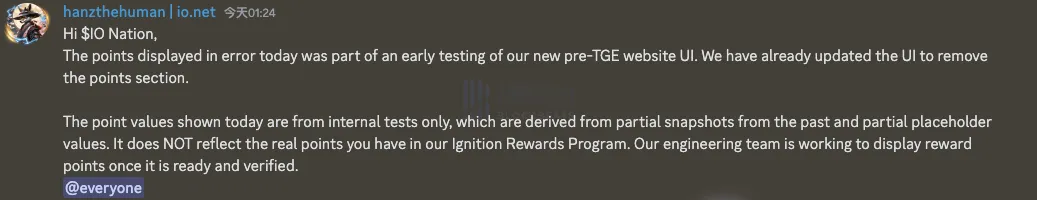 io.net:网站显示的用户积分仅来自内部测试,并不反映用户在 Ignition 奖励计划的真实积分