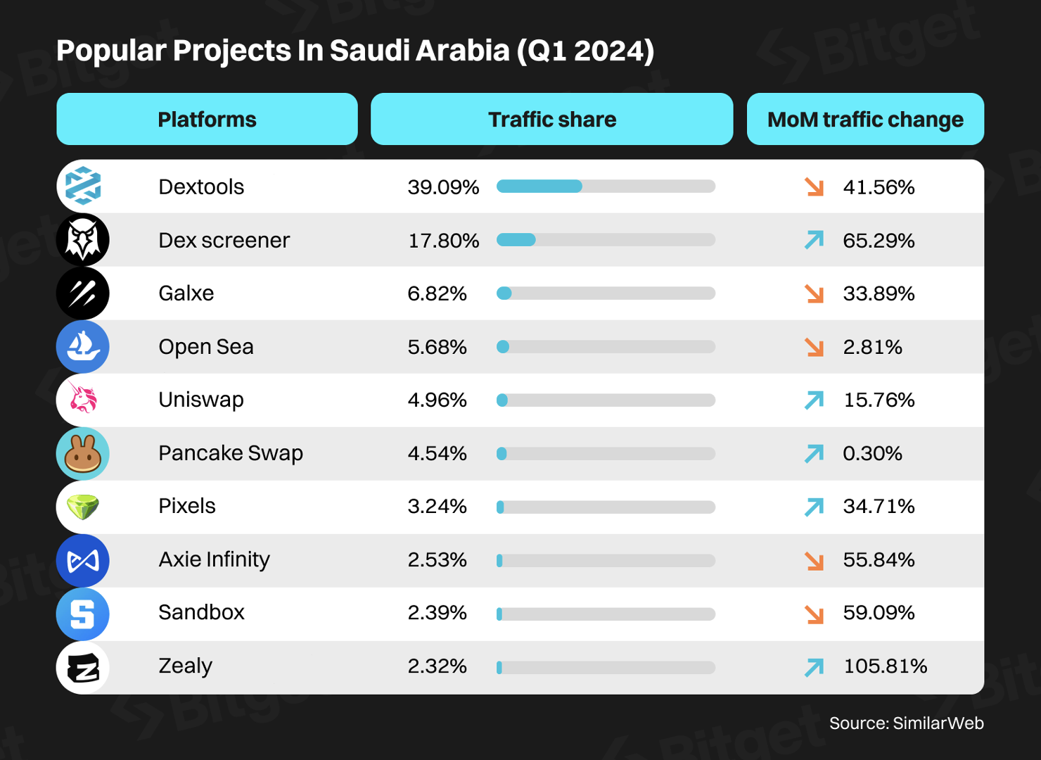 【沙特】:沙特用户参与DEX交易,Web3任务平台,NFT交易和游戏领域热情较高。NFT交易主要在Opensea、Magiceden平台上;另一方面有少量用户使用Sandbox和Axie,Web3任务平台方面主要集中在galxe和zealy。