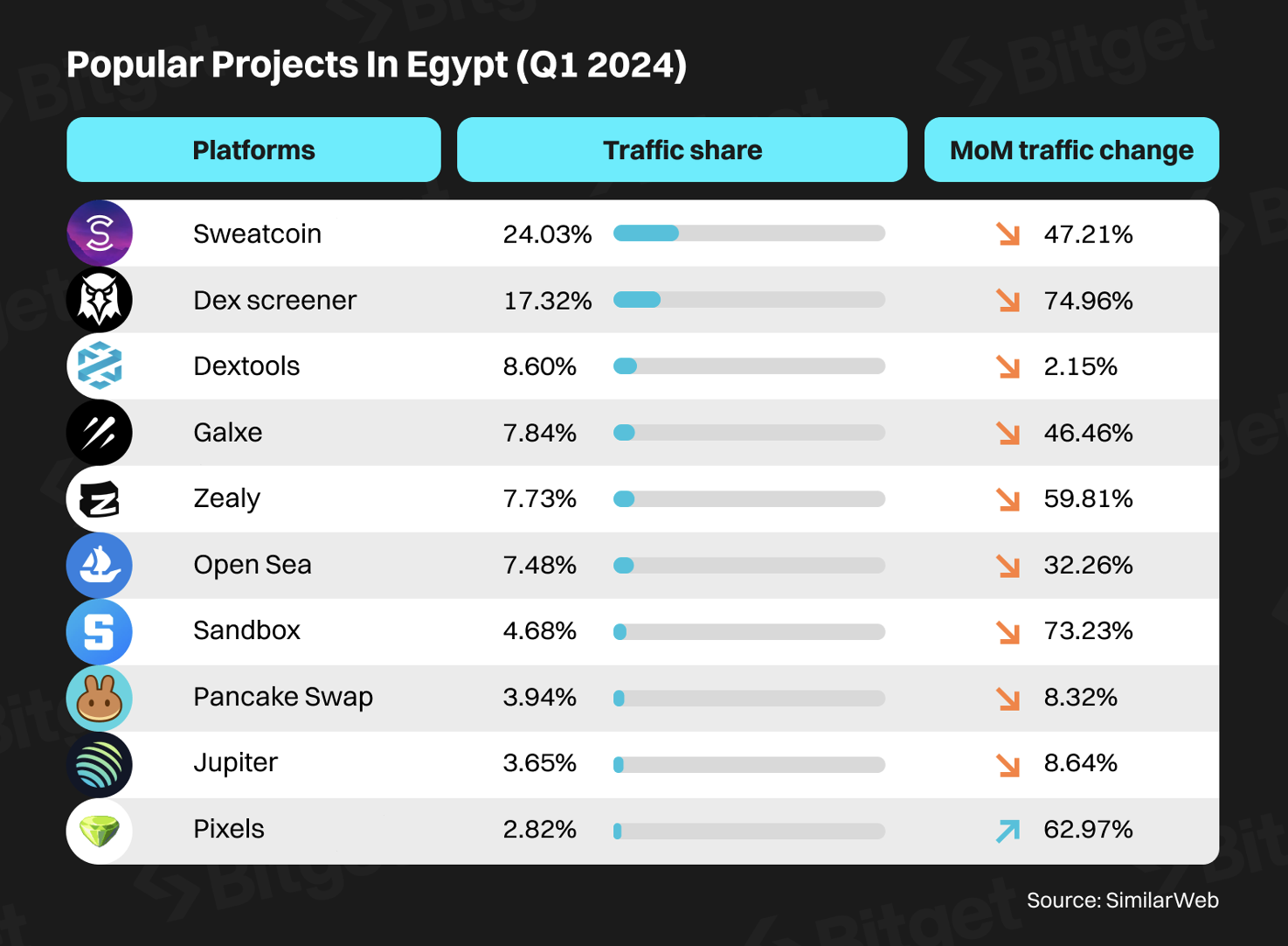 【埃及】:埃及用户在Web3游戏、DEX交易、NFT和任务平台参与度较高。Sweat Economy在埃及较受到欢迎,说明M2E模式在埃及较为收到欢迎;DEX方面主要是行情网站和PancakeSwap;游戏方面除了Sandbox以外,近期较为火热的Pixels在埃及也有一定的关注度。