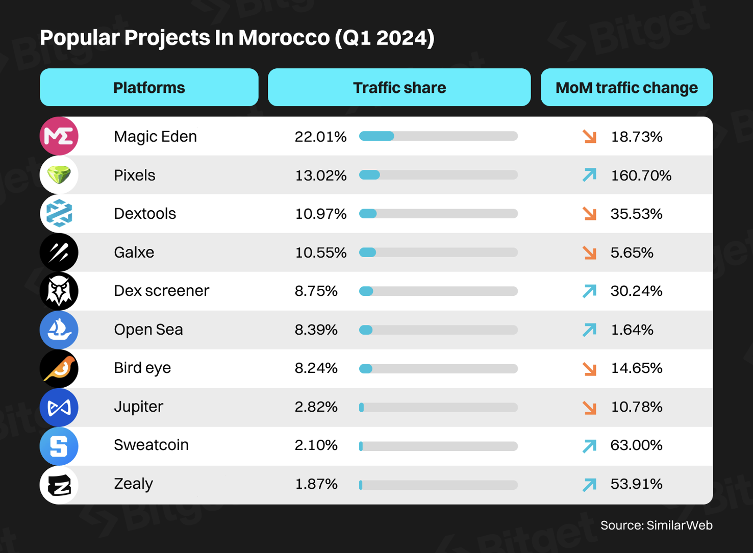 【摩洛哥】:摩洛哥用户参与NFT、DEX交易参与度较高。NFT交易主要在Opensea、Magiceden平台上;另一方面有少量用户使用Sandbox和Sweat Economy。
