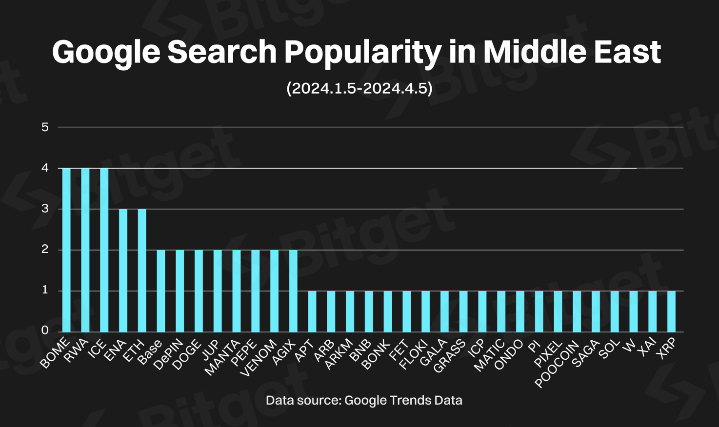 贝莱德宣布推出了其首个在公链上发行的代币化基金,巨头的入场焕发了RWA赛道的第二春,RWA可能仍将是本轮牛市最重要的叙事之一。中东各国对「RWA」热词本身的搜索量高,但是上榜代币却只有ONDO一个,GFI、MKR等均为上榜。结合ONDO也是Bitget研究院西欧市场调研报告中的“西欧地区2024年初Google Search加密货币相关词汇搜索排名榜第5名”,可以看出ONDO或为本轮RWA炒作的旗舰代币之一。