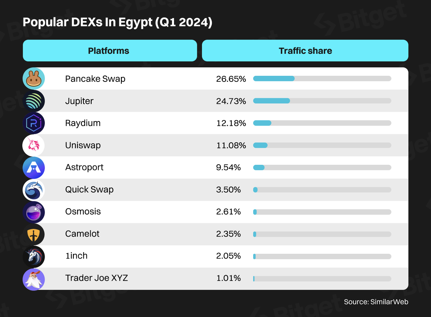 在搜索与转化上,埃及和摩洛哥用户与其他国家用户类似,主要是通过直接登陆,Google搜索,社交媒体转化和加密货币资讯网站转化等方式进入去中心化交易所。其中coingecko更受摩洛哥用户欢迎、coinmarketcap更受埃及用户欢迎。