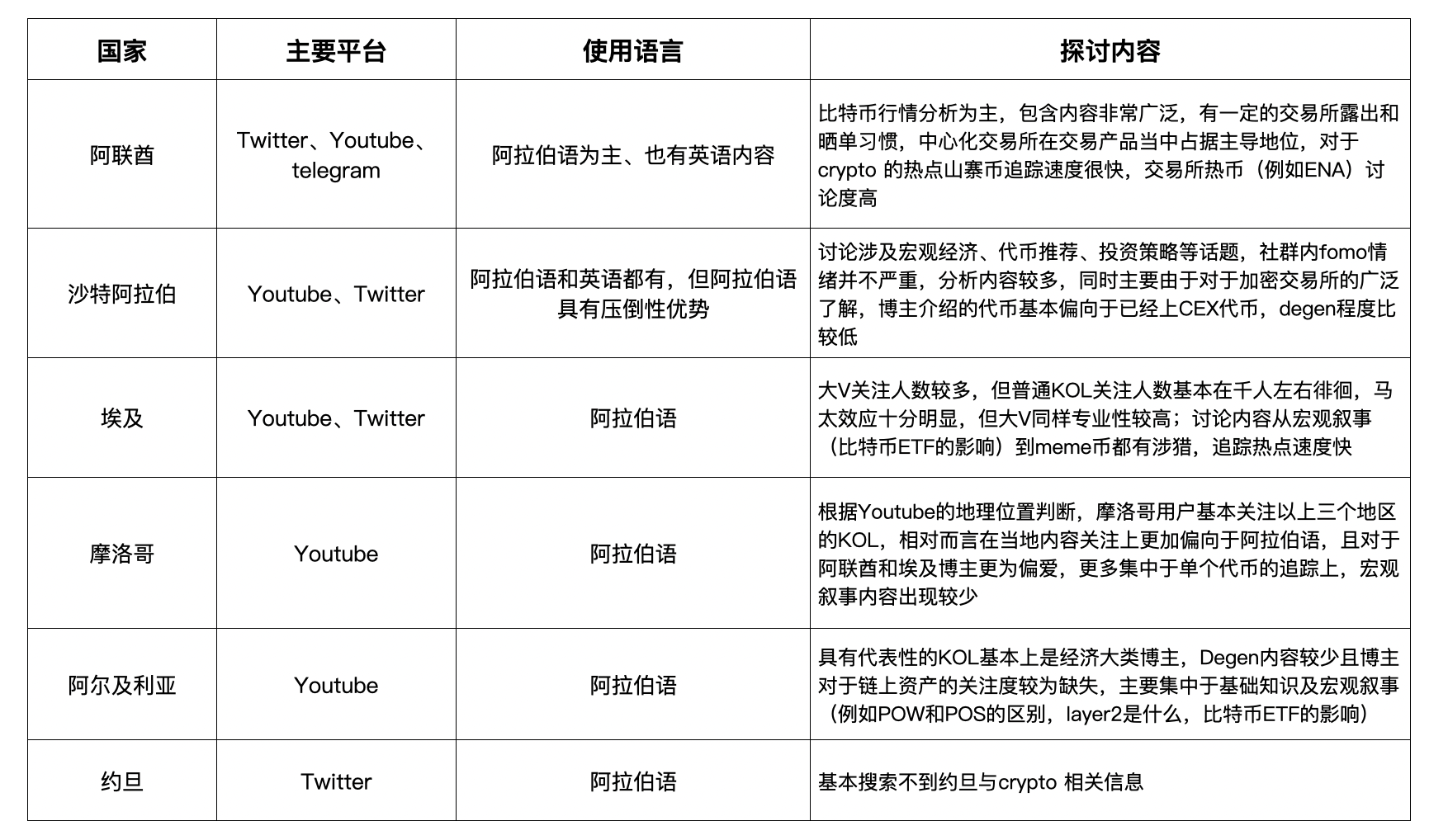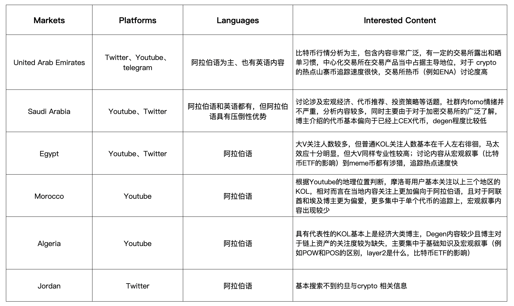探讨内容方面,各个国家对于区块链的了解程度和关注内容各不相同,沙特、埃及、阿联酋三个国家由于有一定用户基础,包含内容非常广泛,有一定的交易所露出和晒单习惯,对于 crypto 的热点山寨币追踪速度很快,交易所热币(例如ENA)讨论度高。但摩洛哥、阿尔及利亚和约旦等由于用户基数较少,基本无太多本国博主,关注内容主要取决于其他三国的内容生产者。
