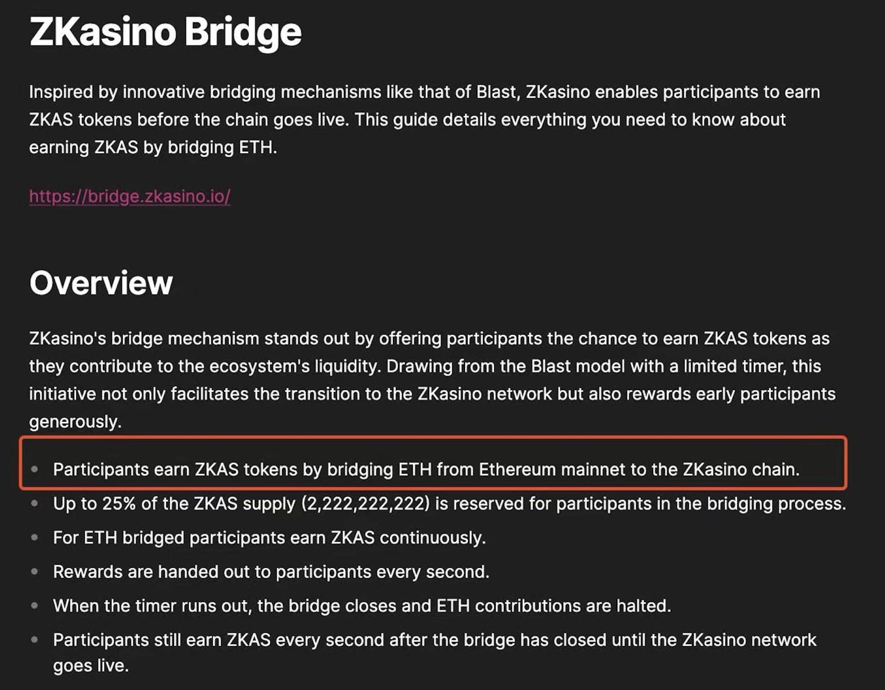 4 月 20 日晚,有不少社区用户反映,ZKasino 将其官网 Bridge funds 界面中「Ethereum 将被返还和可被桥接回去」删除,导致用户无法提款。同时,该项目的白皮书文档不仅将用户质押资产偷偷修改为捐赠模式,还强制「ID0」,将用户真金白银质押的 ETH 全部转换为自身平台代币 $ZKAS。
