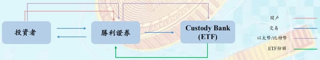 交易:投资经理经与客户沟通、评估客户财务状况、投资目标、适合性分析,确定客户适合以实物方式申购以太坊 / 比特币 ETF 后,投资经理将申购指令给到胜利证券,胜利证券用客户存入的以太坊 / 比特币认购对应 ETF 份额;