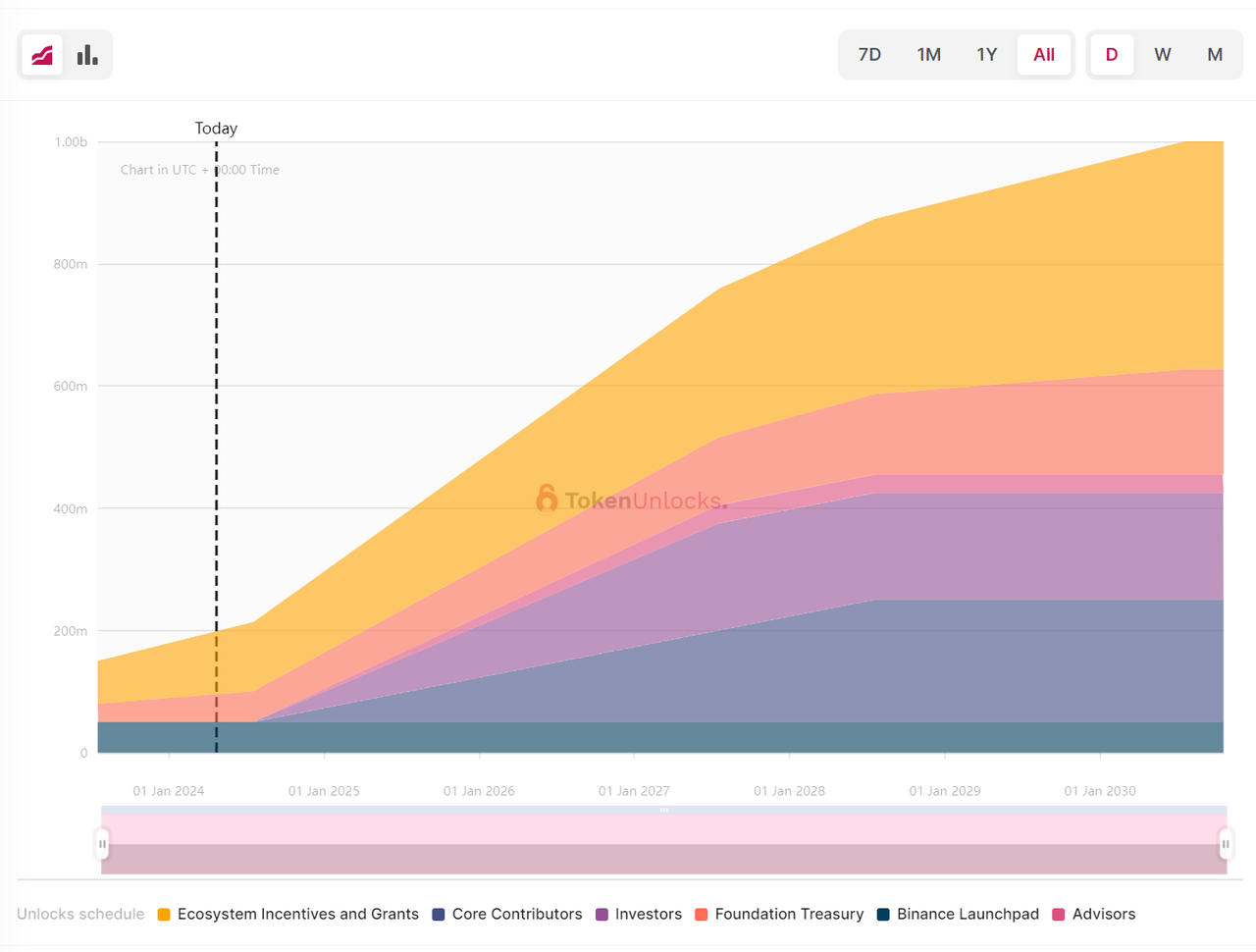 在本月的代币解锁风波中,Arkham 因 Nansen 与 0xScope 发文表示其未按规定解锁代币,从而导致巨大争议与风波,币价也在质疑声中不断走低。虽然后续 Arkham 发文澄清,但效果甚微。从 4 美元一路超跌至 1 美元附近后,ARKM 近期的反弹也在情理当中。值得注意的是,今年 7 月份 ARKM 将会迎来解锁高峰,投资者需密切留意。