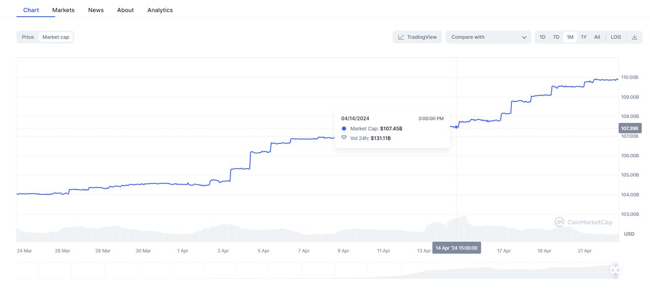USDT 市值已创下历史新高。即便在市场处于下跌的过程中,其市值从 4 月 14 日的 1070 亿美元,不断增涨至近 1100 亿美元,短短不到 10 天,就有近 30 亿美元资金流入,抄底情绪仍然相对旺盛。