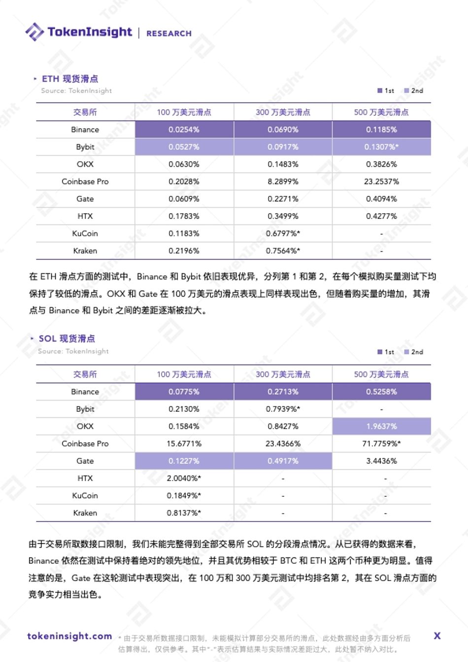 Binance 在 SOL 滑点上的优势相较于 BTC 和 ETH 更为明显。Gate 在 100 万和 300 万美元测试中排名第 2。