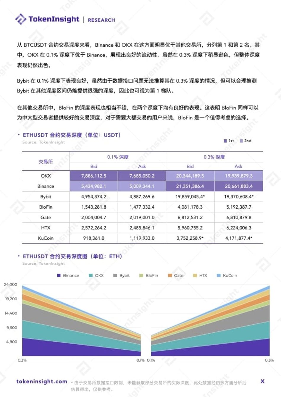 Binance 和 OKX 在 BTCUSDT 合约交易深度上分列第 1、2 名。其中,OKX 在 0.1% 深度下的数据优于 Binance。