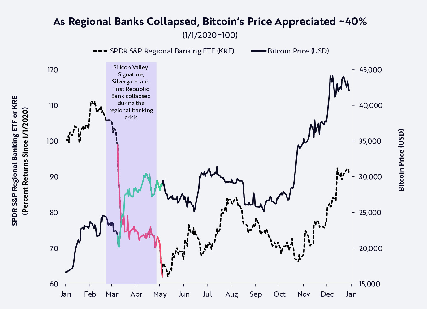 比特币在地区性银行危机中表现就是一个显著的例子。2023 年初,在美国地区性银行历史性倒闭期间,比特币的价格上涨了 40% 以上,凸显了其对冲交易对手风险的作用,如下图所示。