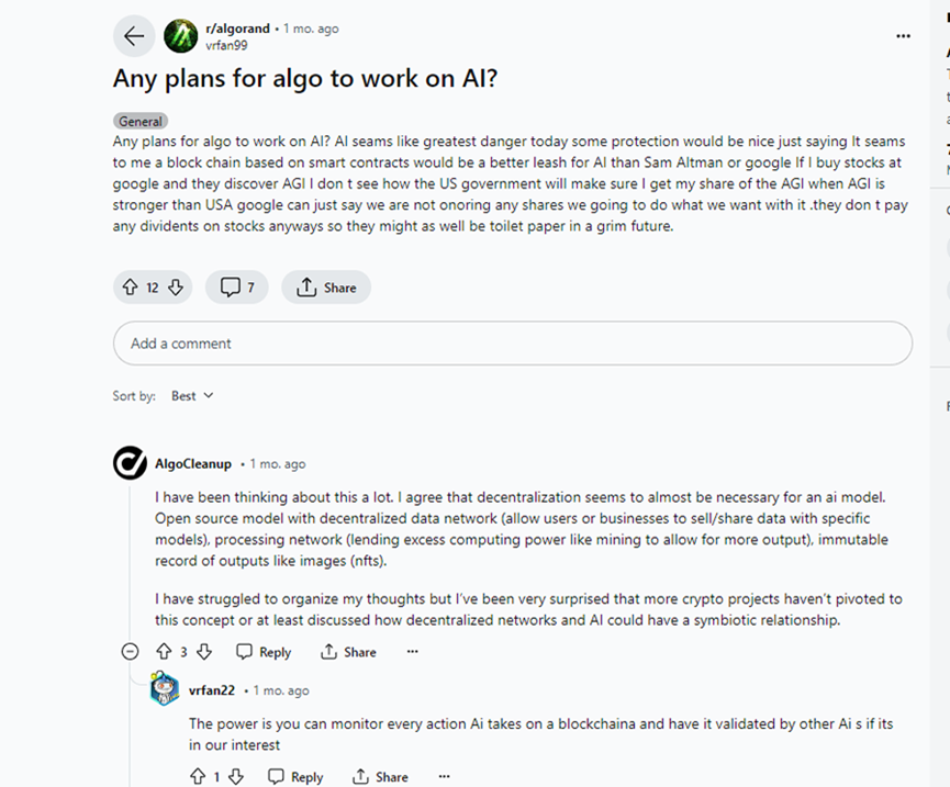 一位社群成员曾于今年在论坛上向 Algorand 询问道:是否有计划将 ALGO 应用于人工智能吗?
