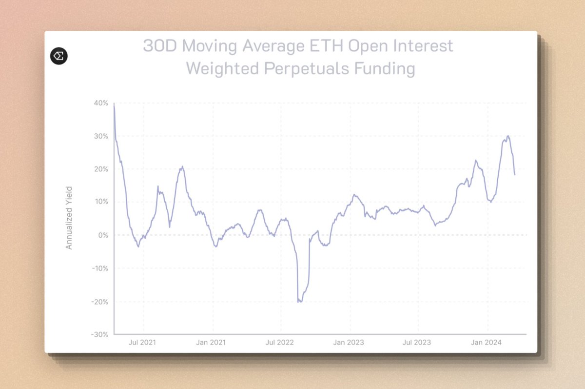 Open Interest指的是在交易所中未平仓合约的总数。在这里,它特指ETH在中心化交易所中的永续合约未平仓头寸的总价值。目前这个数字约为120亿美元(2024年4月)。这个数字反映了市场参与者对ETH的当前持仓水平。