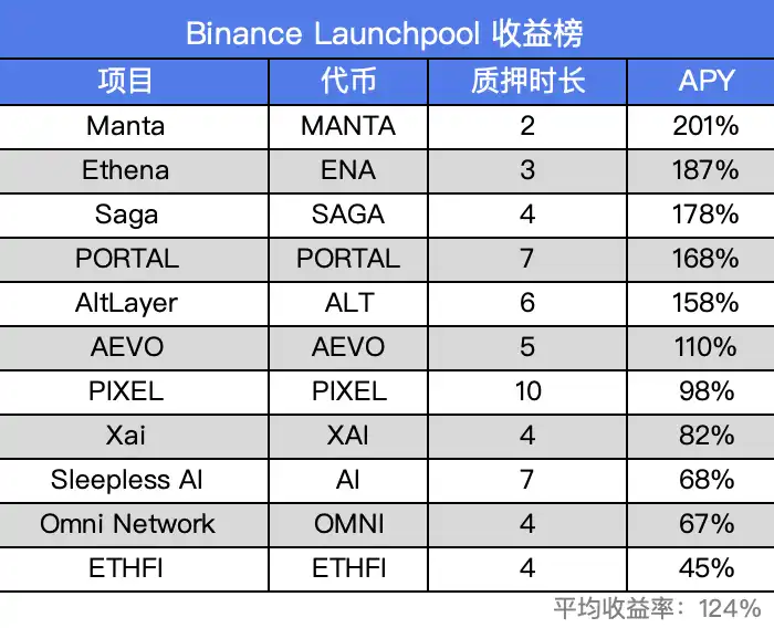 根据公开资料整理,Binance 2024 年以来一共进行了 11 次 Launchpool,平均年化收益率为 124%。