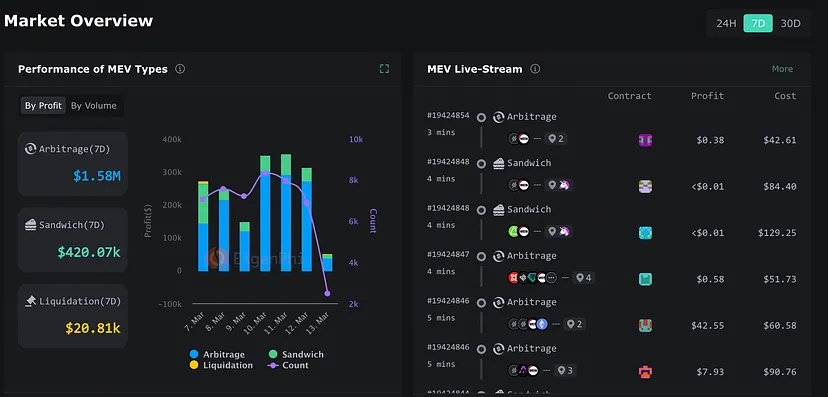 平台能够提供各类 MEV 活动的实际交易量和实际利润(扣除矿工费后的毛利)信息,包括它们的占比和增长情况。这样用户便可以获得一个非常清晰且全面的当前 MEV 市场的概览。用户可以清楚地实时地看到交易所涉及的 MEV 类型,发起 MEV 交易的合约地址,实际收益和开销等数据。