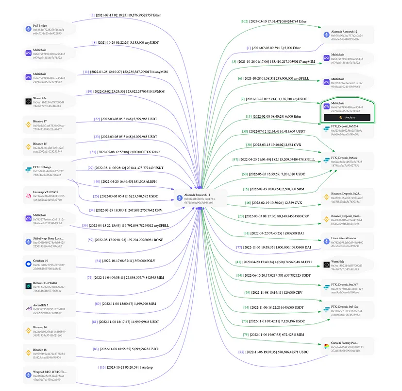 Arkham Visualizer 允许用户以视觉化的方式追踪跨链的资金流向。通过这一功能,用户可以利用过滤功能,根据区块链、时间、币种、金额大小等条件筛选出所需的资金流动,从而清晰地识别资金的流入和流出。