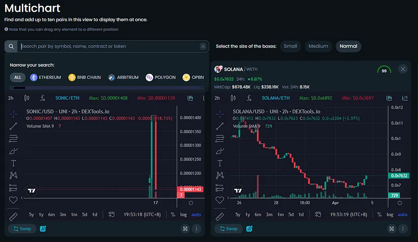 Multichart 允许您为任何给定的区块链和交易场所的代币对设置多达十个图表。使用过滤器搜索您选择的资产,以便通过区块链和交易场所缩小范围。DEXTools 图表允许您更改时间参数和图表类型,并提供一系列工具和指标以支持技术分析。