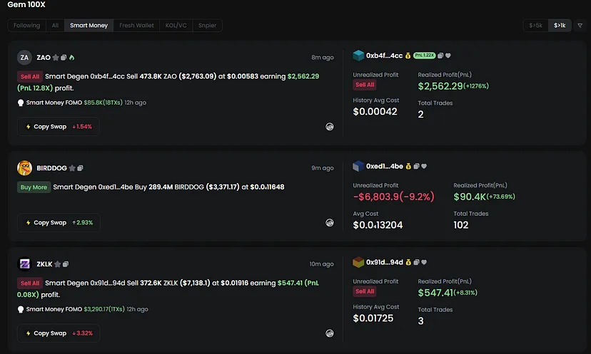 Gmgn.ai 是一个专门追踪聰明錢和 Degen KOL 交易記錄的平台,清晰展示了盈利的聰明錢的交易记录。