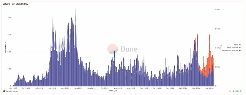 鉴于 Base 公链在坎昆升级后的交易费用显著降低,它已成为继 Solana 之后另一个土狗聚集的公链平台。 作为一个资深的 Sniper Bot,Unibot 在 Base 平台上的交易量也有所增加。