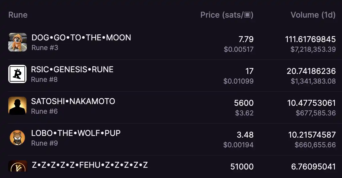 尽管 Runestone 的价格持续走低,但其空投的 Runes 模因币 DOG 自 4 月 24 日空投以来一直呈上升趋势。根据 Magic Eden 的数据,DOG•GO•TO•THE•MOON 的当前单价为 7.79 sats,24 小时交易量高达 111 BTC,断层碾压其他 Runes 资产,暂居 Runes 龙一。