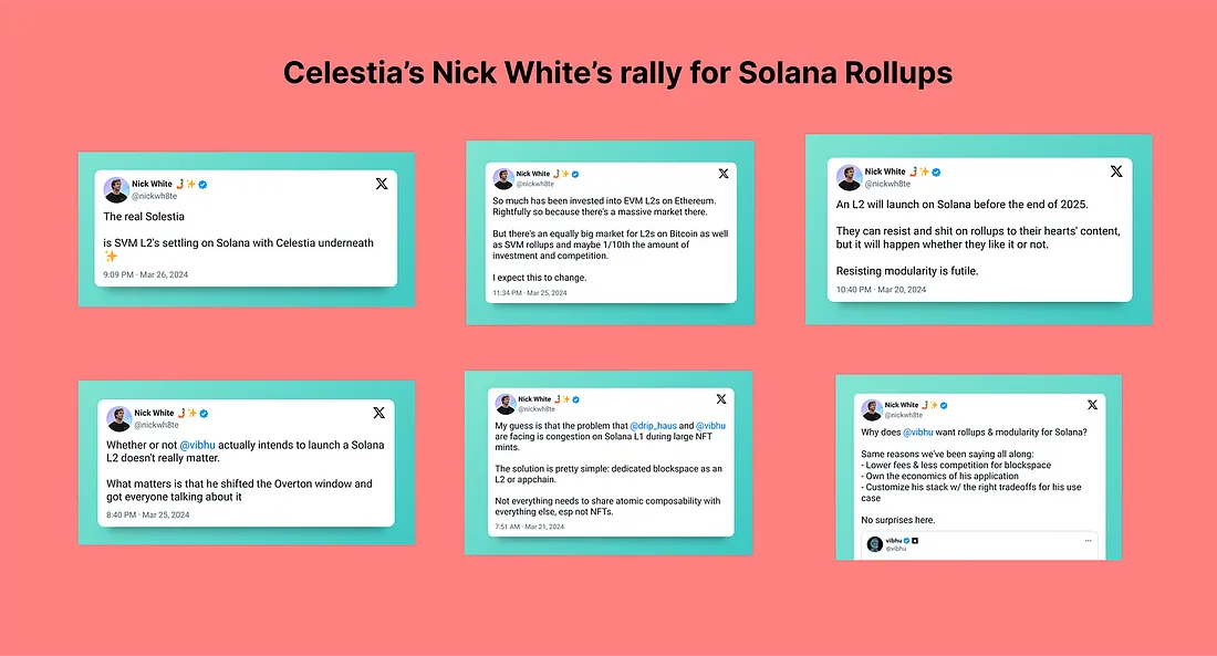 术语“ETH对齐”或更好的“ETH资产包偏好”一词已成为流行的梗。你认为为什么Layer 2和Restaking/EigenLayer成为最热门的叙述?这是因为它们增加了“ETH的货币属性”,而ETH被用作核心资产。相同的原则也适用于Solana。Solana社区将会团结在任何能够增强他们SOL持有的解决方案周围,就是这么简单。随着Solana生态系统的扩张,曾经被忽视的“SOL的货币属性”将变得重要起来。记住,大多数Rollup都是“营销手段”,并且由于市场仍然更加重视基础设施而非应用程序,它们提供了更好的代币价值积累。