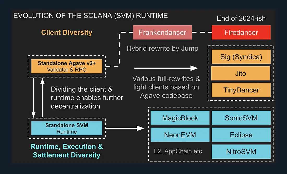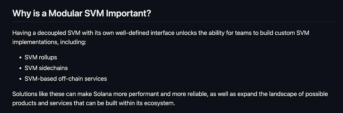 使Solana模块化的努力已经开始。正如Anza DevRel的帖子所示,Solana验证者和SVM(处理交易和智能合约/程序的执行环境)紧密耦合,并由Anza维护。然而,验证者客户端和SVM运行时将在接下来的几个月内分离。这种分离将为分叉SVM和轻松创建'Solana应用链'提供便利。
