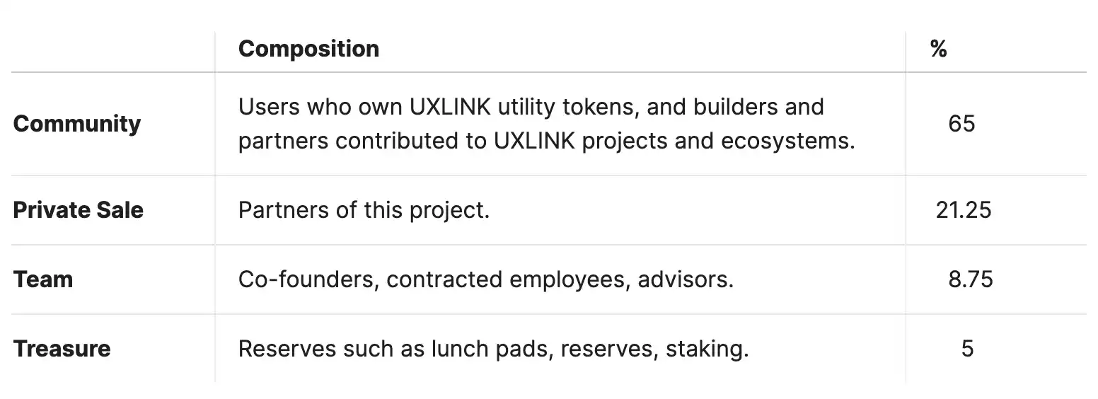 而 UXLINK 则主要用于社区治理以及从 UXLINK 项目和产品中获取收益。其总供应量不超过 1,000,000,000,其中 65% 分配给社区,用户份额占比 40%,开发者和合作伙伴约占 25%。