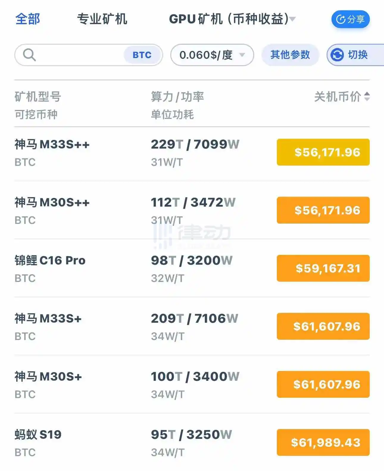 3. 蚂蚁 S19、神马 M30S+等系列矿机均已到达关机币价;