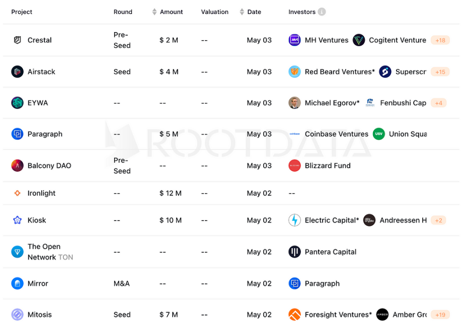 其他 Web3/ 加密应用公布 7 起融资,其中 Web3 内容发布平台 Paragraph 完成 500 万美元融资,USV、Coinbase Ventures 参投;